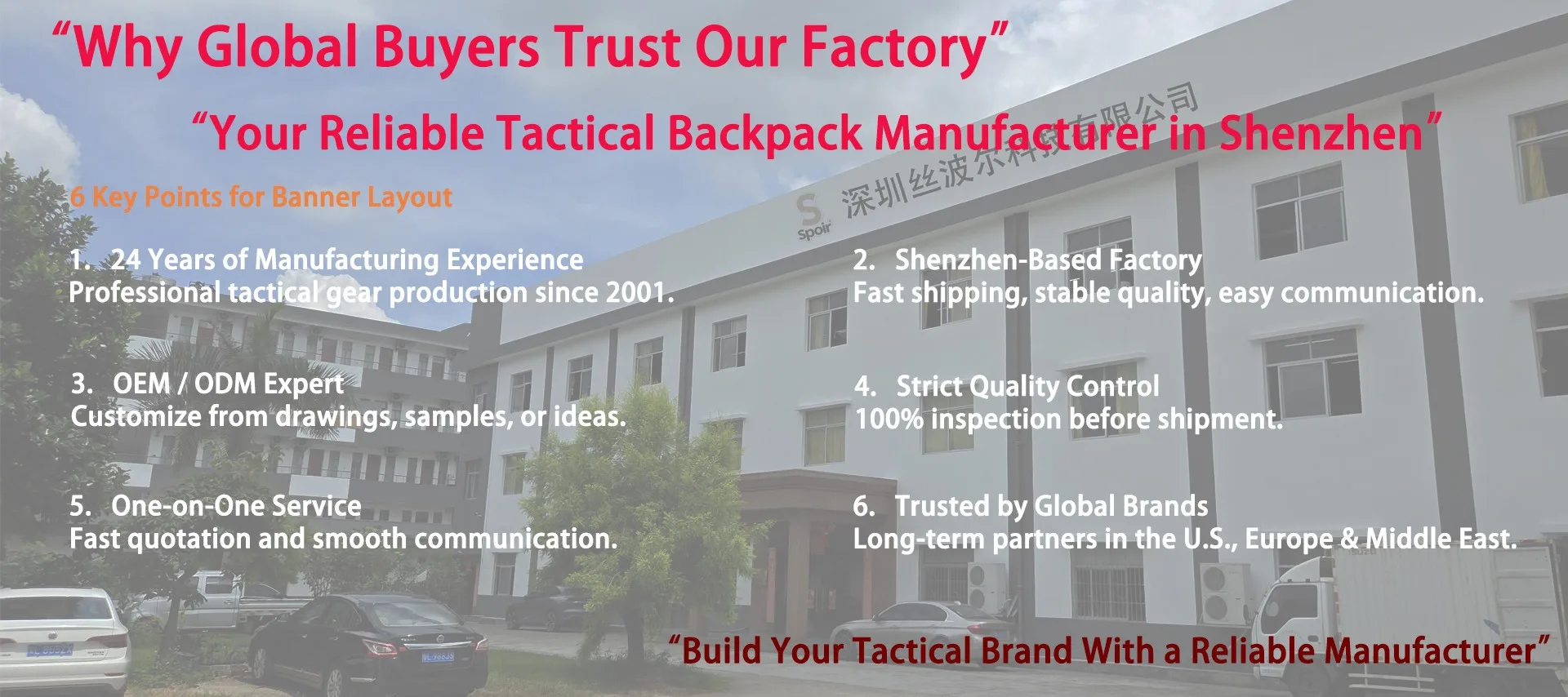 Shenzhen Spoir Technology Co., Ltd. was established in 2001. It has been focusing on the research and development, design and manufacturing of handbags and luggage for 24 years. The company has two intelligent production bases in Shenzhen and Huizhou and a professional team of more than 400 people. It is equipped with 120 advanced equipment such as Japan's JUKI intelligent sewing machines, 10 full-process production lines, and a daily production capacity of 20,000 pieces. The company takes design innovation as the core. The professional team of 80 people integrates international trends with ergonomic concepts to create a product matrix of tactical backpacks, outdoor sports backpacks, computer bags, tactical vests, travel cases, fashion handbags, tool kits and other categories. It develops more than 3,000 new products every year and has 12 patented technologies such as modular storage systems, waterproof technology fabrics, and ergonomic design. The company has passed the ISO9001 quality management system cert